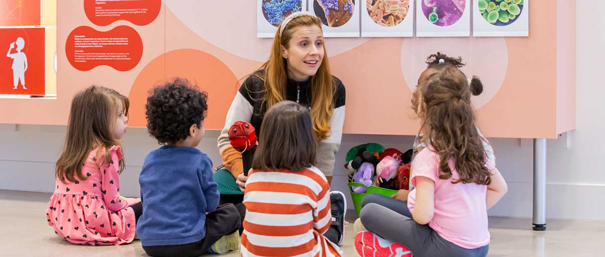 Au programme : accompagnés d’un animateur ou d’une animatrice, découvrez le lien entre santé et environnement en observant des insectes et des fleurs à la loupe, qu’il vous faudra ensuite dessiner! Puis, à travers diverses activités incluant un cherche et trouve dans l’exposition, apprenez-en davantage sur le corps humain, les microbes et la façon dont ils coexistent.