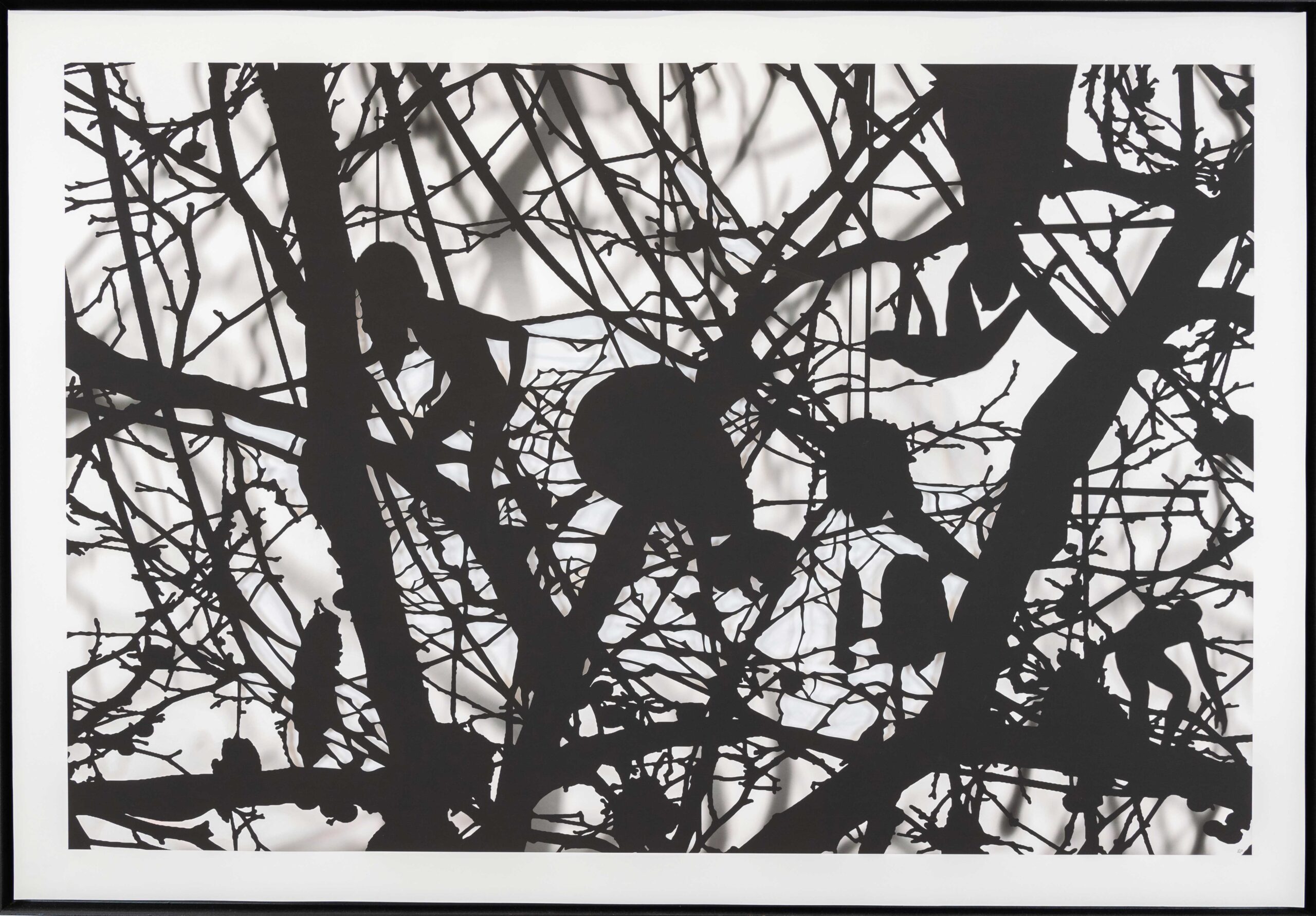 Cette photographie découpée s’apparente aux découpages traditionnels de papier chinois. L’artiste s’inspire de mythes asiatiques ou de contes occidentaux pour créer ses univers fantastiques et inquiétants. Ses personnages énigmatiques aux grandeurs variées – enfants ou lilliputiens – marchent en équilibre, tels des fantômes, sur les branches de cette forêt broussailleuse. Ici, notre œil est trompé puisque, derrière le papier découpé, on peut voir les ombres du papier et celles reproduites en trompe-l’œil par une photographie d’ombres. Cette cohabitation, entre le réel et la reproduction, ajoute un effet de profondeur à l’œuvre, qui semble émerger du mur.